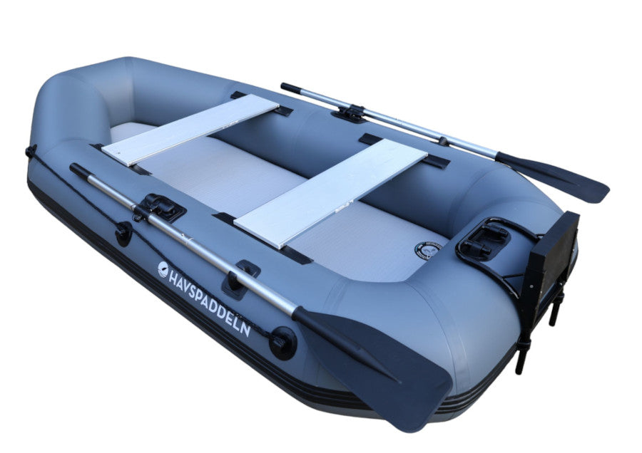 Das Boot lässt sich leicht aufblasen, ist leicht zu transportieren und bietet dank zweier robuster Aluminiumsitze hohen Komfort. Es wird mit zwei Rudern geliefert und kann für mehr Leistung und Reichweite mit einer Motorhalterung (optionales Zubehör) ausgestattet werden. Das maximale Motorgewicht beträgt 25 kg.
