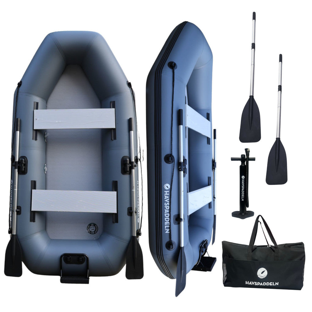 Dieses Schlauchboot ist eine praktische und vielseitige Wahl für alle, die ein stabiles und einfach zu bedienendes Boot suchen, das sich mühelos transportieren und platzsparend verstauen lässt. Dank seiner robusten Konstruktion, der grauen Farbgebung und der durchdachten Designdetails eignet es sich perfekt für Seen, ruhige Gewässer und kurze Ausflüge zu Angelplätzen oder Badebuchten.
