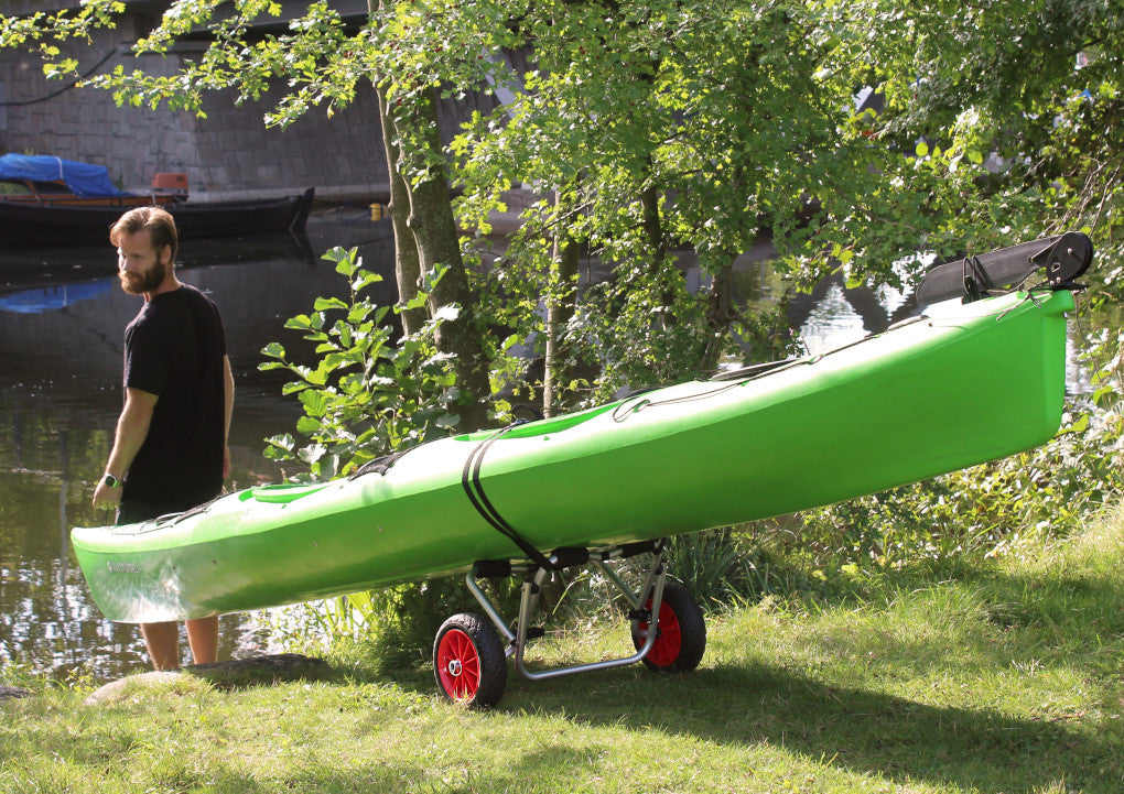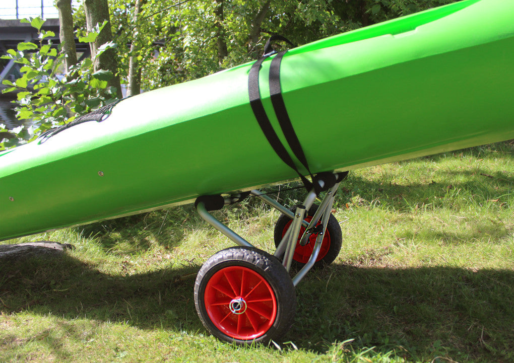 Der Wagen ist für die meisten Kajakmodelle geeignet, sogar für Doppelkajaks/K2. Am einfachsten lässt er sich verladen, indem man das Heck des Kajaks auf den Wagen stellt und mit dem Gurt sichert. Sobald das Kajak positioniert ist, kann man es leicht bewegen, indem man es am Bug festhält. Dank des Stützbeins kann der Wagen auch als Ständer verwendet werden, wenn das Kajak nicht bewegt wird.