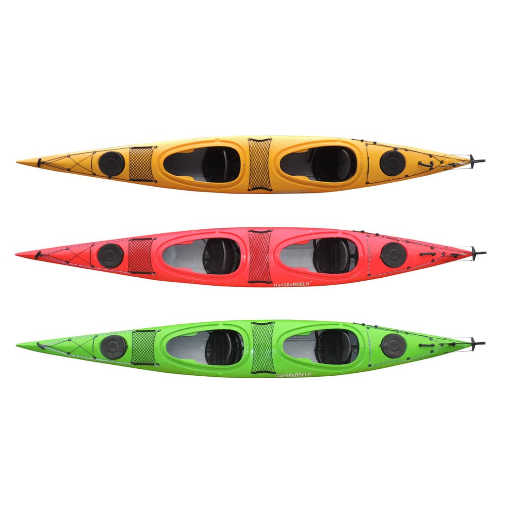 Havspaddeln Triton is a very popular tandem kayak among families and recreational paddlers alike. With its two large cockpits and adjustable backrests it offers comfortable paddling for two, but it also works excellently as a solo kayak. Its clever design even allows you to have a small child in your lap while paddling, making it a great choice for family adventures.