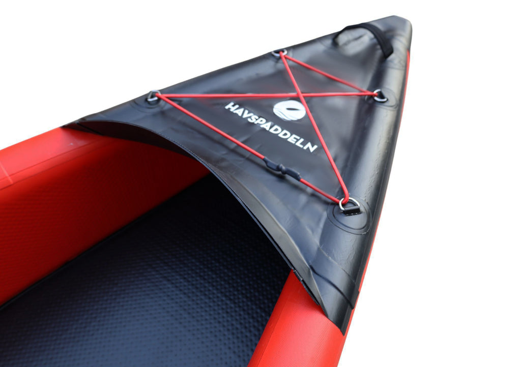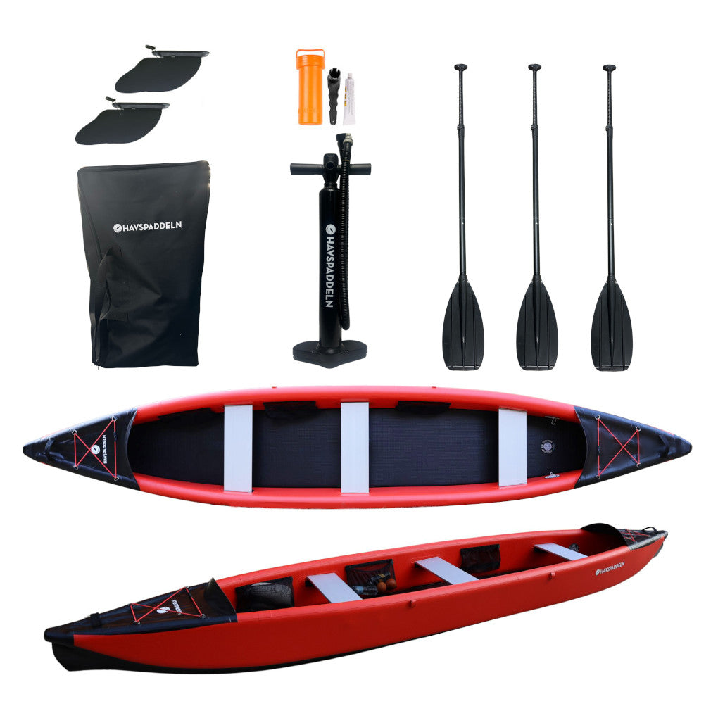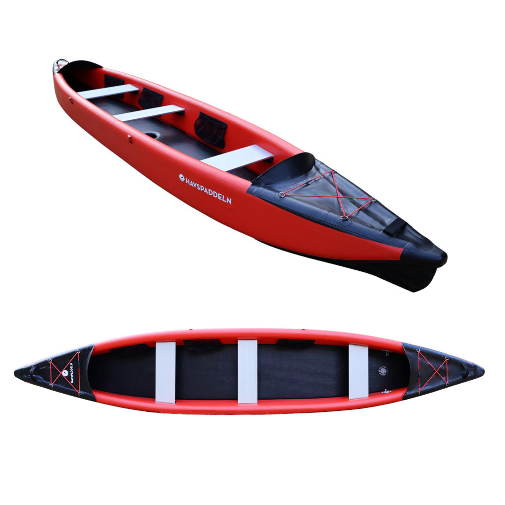Das gesamte Kanu, einschließlich des Bodens, ist in Drop-Stitch-Bauweise gefertigt. Dies verleiht dem Kanu eine stabile Basis und sorgt zusammen mit den beiden großen Finnen für eine hervorragende Spurstabilität.