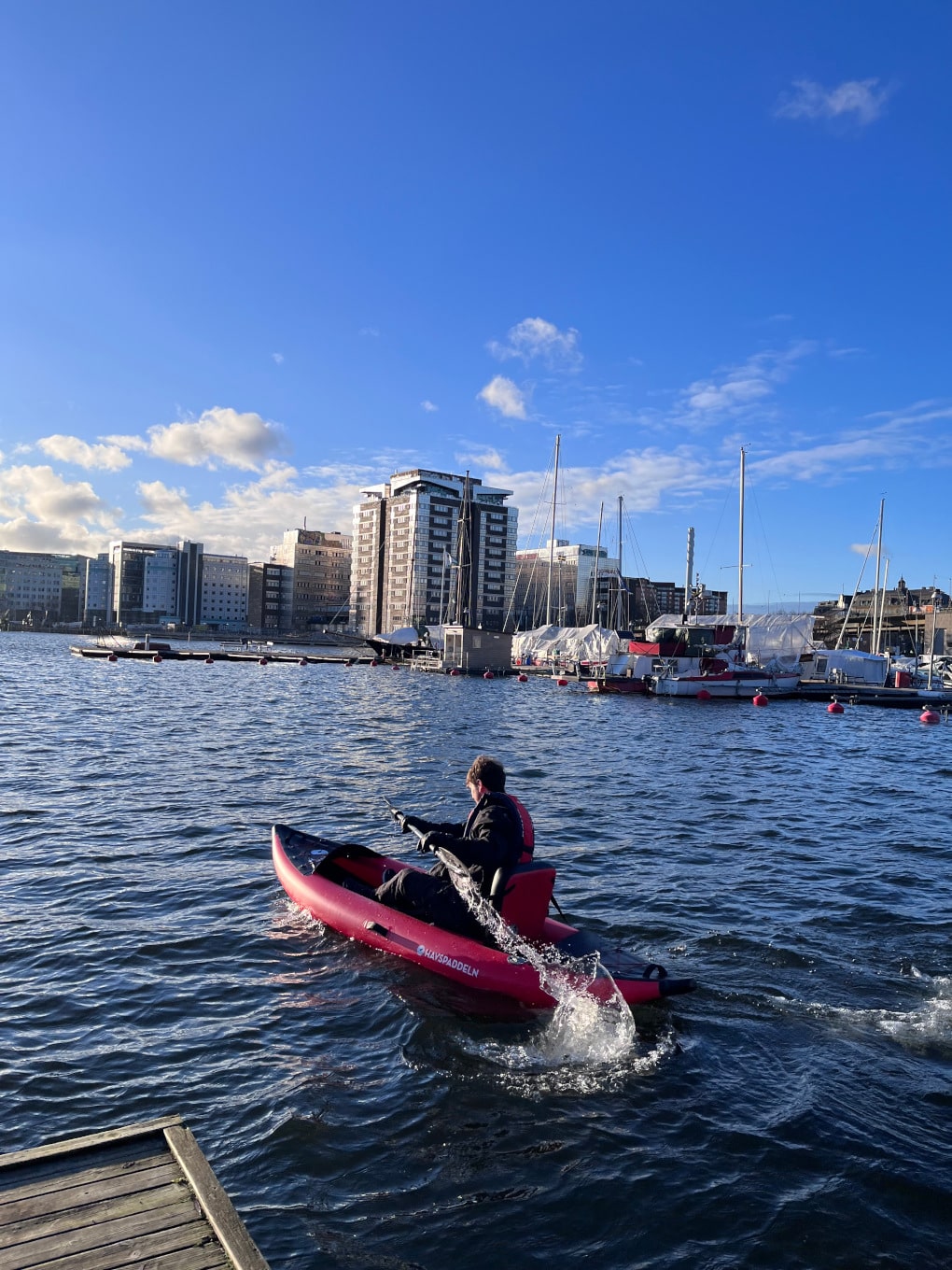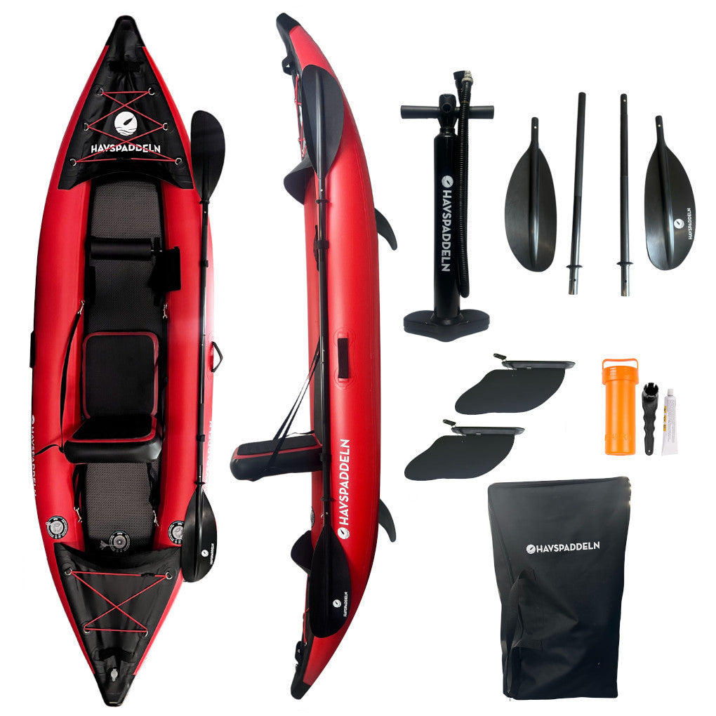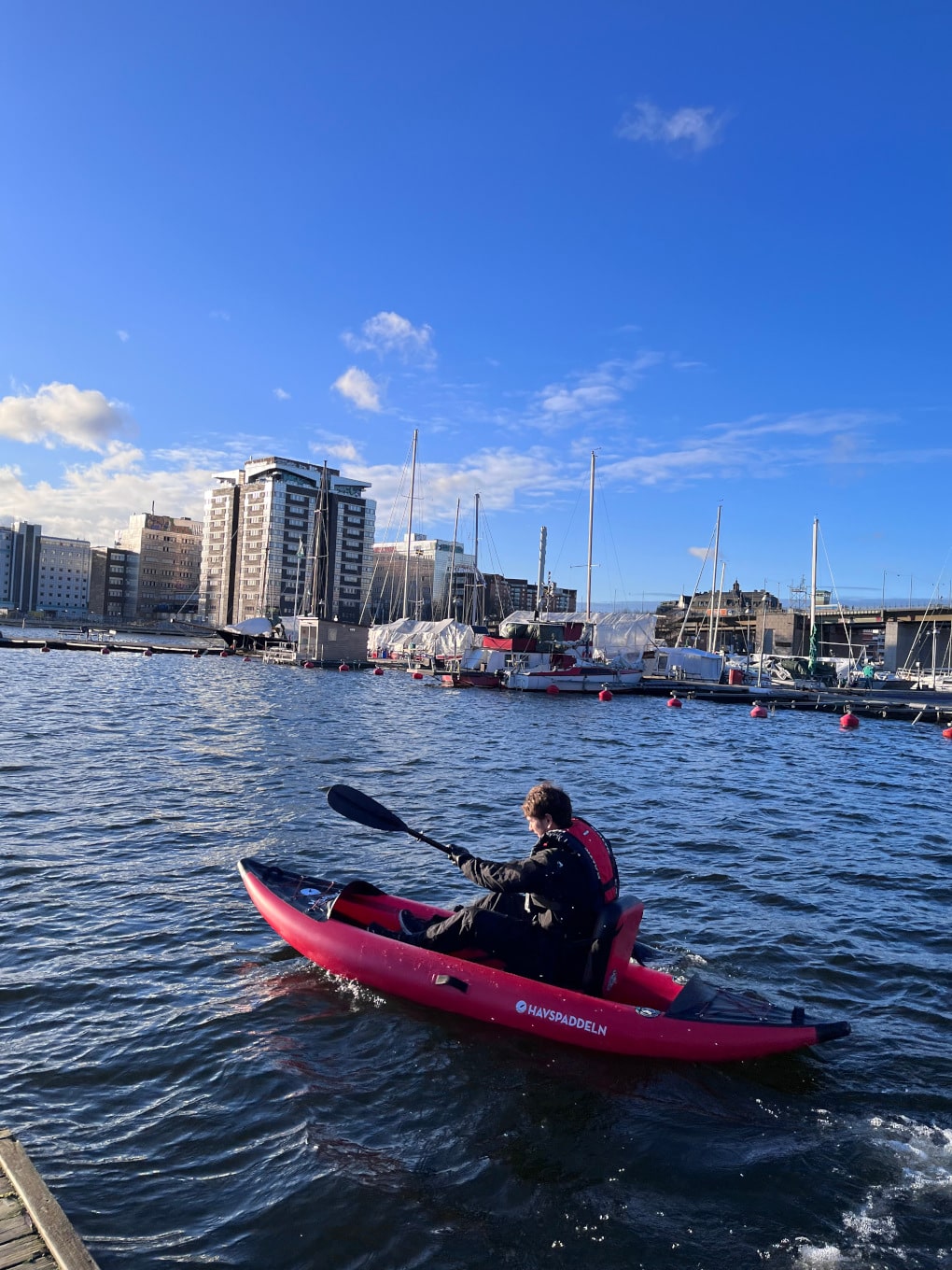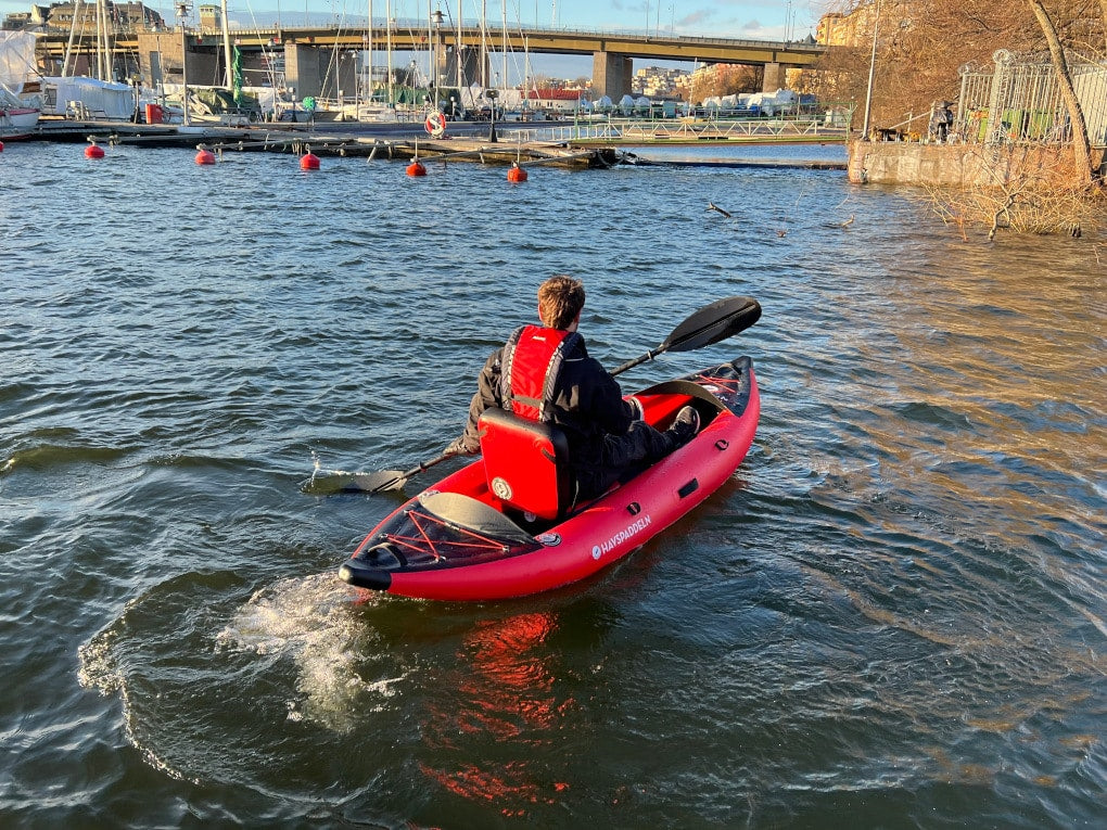 Das Havspaddeln Frej ist aus widerstandsfähigem PVC-Material gefertigt, das starker Beanspruchung standhält. Das Material ist genau dasselbe wie bei unseren SUPs, die wir im Verleihbetrieb verwenden und auf die wir großes Vertrauen setzen. Bug und Heck des Kajaks sind mit Hartplastik ausgestattet, sodass es auch bei versehentlichem Paddeln gegen Stege, Steine oder Ähnliches keinen Schaden nimmt. Mit den Finnen unter dem Kajak sollte man vorsichtig sein, aber es handelt sich um eine größere und widerstandsfähigere Variante, die ebenfalls viel aushält.