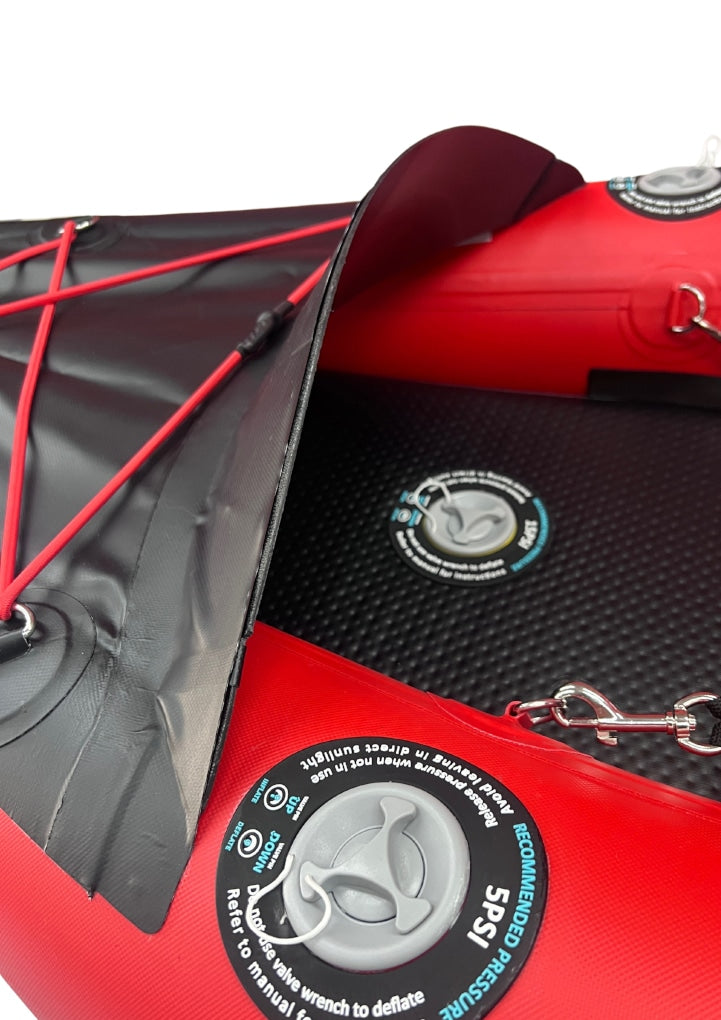 Ein aufblasbares Einzelkajak ist offener als ein herkömmliches Seekajak, wodurch sowohl der Paddler als auch das gesamte Gepäck stärker dem Wasser ausgesetzt sind. Daher ist es wichtig, sowohl vorne als auch hinten einen Spritzschutz zu haben, der einen Großteil des Wassers abhält, das sonst ins Kajak gelangen würde.