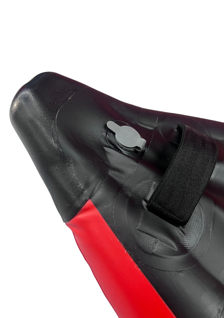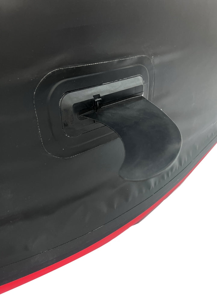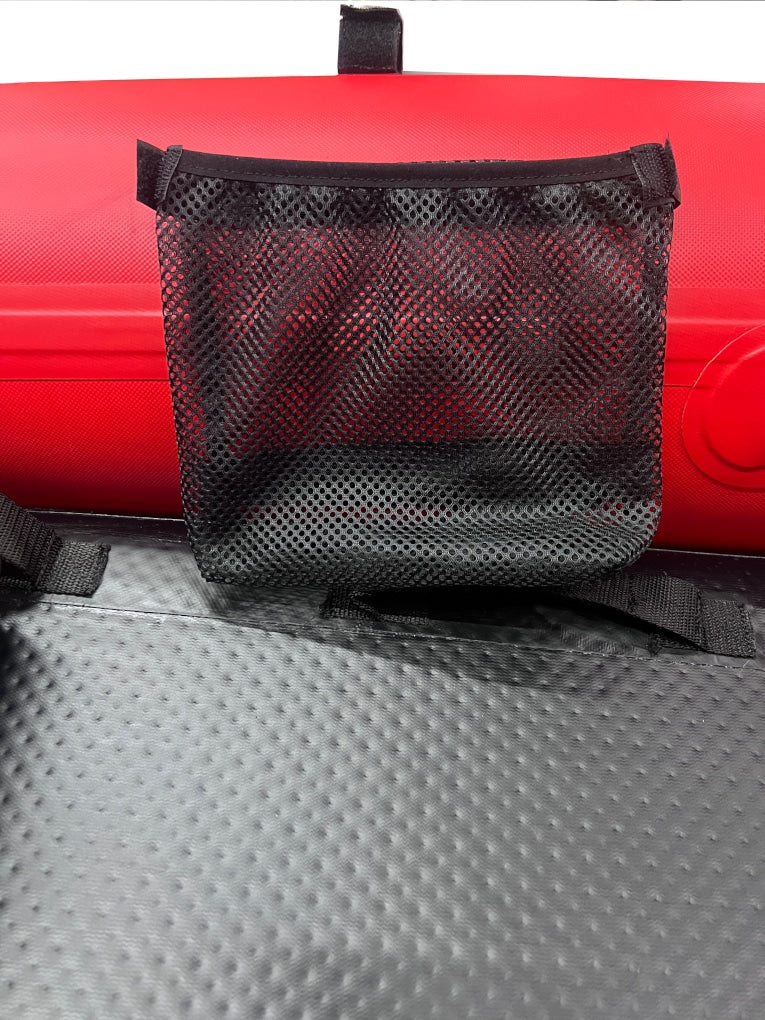 Ein aufblasbares Einzelkajak hat keine Gepäckluken, aber dieses Modell verfügt stattdessen über "Taschen" vorne und hinten. Diese haben wir extra groß gestaltet, um das Gepäck bestmöglich zu schützen, aber auch um zu vermeiden, dass zu viel Wasser ins Kajak gelangt. Es ist ausreichend Platz vorhanden, um Gepäck für Übernachtungen oder lange Tagestouren mitzunehmen. Auf den Taschen befinden sich außerdem elastische Spannbänder, an denen man weitere Ausrüstung wie z.B. wasserdichte Beutel befestigen kann. Es gibt auch eine kleine Netztasche direkt am Sitz für kleinere Dinge wie Handy, Sonnenbrille oder eine Wasserflasche, die man schnell griffbereit haben möchte.